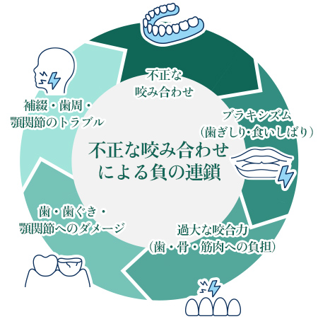 くり返すむし歯やあごの痛みなどの原因は、咬み合わせの乱れに起因している場合があります。当院では、精密な診断に基づき、咬み合わせを理想的なバランスへ整える治療を行っています。歯や顎関節への負担を軽減し、「しっかり咬める状態」へ導くことで、機能面・健康面・審美面のすべてにおいて、さまざまなメリットが期待できます。